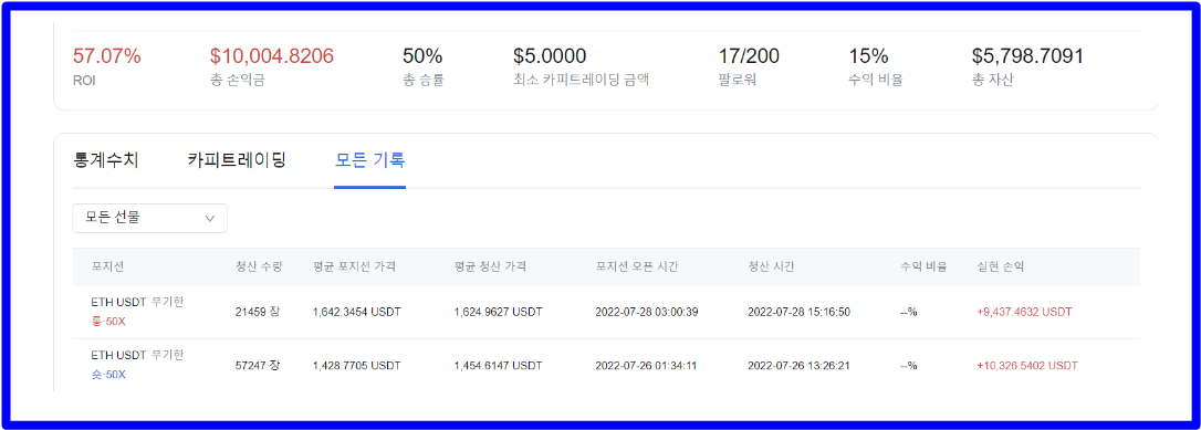 제가 팔로워하고 있는 투자고수의 포지션과 수익입니다. 저도 실시간으로 투자 고수들의 포지션을 확인하면서 매매를 따라 하고 있습니다. 소액이더라도 고수들의 매매를 따라 하니 수익이 늘어나고 있습니다.
