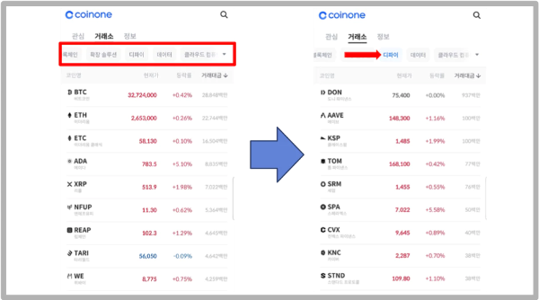 그러나 코인원에서는 결제, 블록체인, 확장솔루션, 디파이, 데이트, 클라우드 컴퓨팅, 게임, 메타버스, NFT, 금융 서비스 등 코인의 목적과 종류에 따라서 자동으로 분류를 해줍니다. 예를 들어 오늘은 디파이 코인이 대체적으로 상승한다고 하면 디파이 코인만 분류해서 투자를 할 수 있습니다. 원하는 종류의 코인만 클릭을 해주면 자동적으로 해당하는 코인만 정렬되게 됩니다.