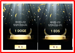 저도 가입하고 뽑기권 2장을 받아서 열어봤는데요, 도지코인과 이오스가 당첨되었습니다. 코인은 당첨 즉시 지급이 되며 5천 원 이상 모아서 인출할 수 있습니다. 이 외에도 6만 원 상당의 솔라나, 12천 원 폴카닷, 260만 원 상당의 이더리움, 5만 원 상당의 이더리움 클래식, 8천 원 상당의 웨이브 코인이 당첨 가능합니다.