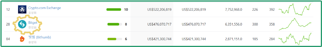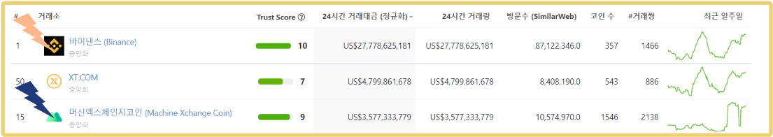 거래대금 기준으로 바이낸스는 순위 1위 멕스씨(MEXC)거래소는 3위에 랭크되어 있습니다. 신뢰도 또한 10점과 9점으로 아주 높은 신뢰도를 보여주고 있습니다.