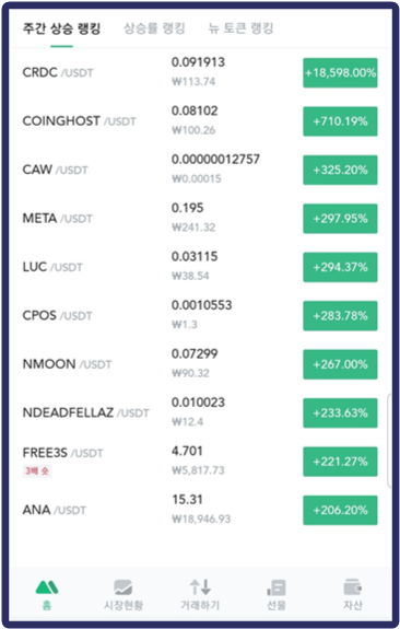 보시다시피 주간 상승랭킹 1위가 18,000%가 넘습니다. 이외에도 200%~700% 상승을 보인 코인들도 많이 있습니다. 펌핑을 통해 수익을 보는 맛에 가상화폐를 거래를 하는 것도 있습니다. 주식시장은 최대 30%가 최대인데 하루에도 수천 % 씩 펌핑하는 코인들이 많이 있습니다.