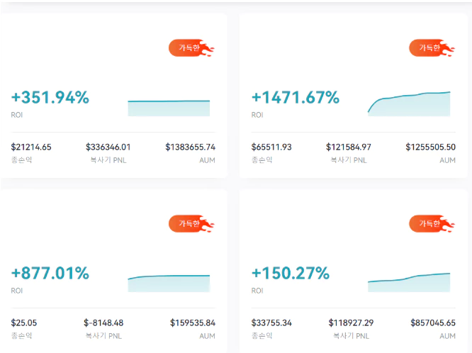 비트겟의 펌핑입니다. 요즘은 장이 안 좋아서 그런지 몰라도 큰 펌핑은 안 나오지만 그래도 꾸준히 펌핑되는 가상화폐들이 많이 나오고 있습니다. 사실 이벤트 금액이 워낙 커서 이벤트 금액만 받아도 10%를 기본적으로 벌고 들어가는 것입니다. 그리고 bitget에는 카피트레이딩이라는 시스템이 있습니다. 투자 고수들의 투자 방식을 따라 하는 것입니다. 이것만 잘 이용해도 최소 100% 이상은 수익을 얻을 수 있습니다.