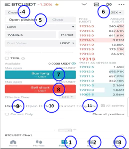 5번(Open position/Close) : 롱이나 숏 포지션의 시작 및 종료(즉, 롱으로 자산이 상승하냐 숏으로 자산이 하락하냐 선택해서 매수하고, 파는 것), 예를 들어 비트코인이 오를 것 같다면 롱 포지션에 오픈 포지션을 하고 적당히 올랐다고 생각되면 클로즈로 파는 것)
