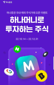 최근 '하나머니'에서 하나머니로 주식투자를 할 수 있는 이벤트를 진행하고 있습니다. 가입시 기본 1만7천원 지급에 최대 20만원 까지 추첨으로 당첨될 수 있는 '하나증권 주식 이벤트'입니다. '하나머니' 가입 및 '하나머니로 주식 거래하기'를 시작하면 기본 1만7천원을 받을 수 있으며 추첨을 통해 1등은 20만 하나머니, 2등은 5만 하나머니, 3등은 1만 하나머니, 4등은 3천 하나머니를 지급하고 있습니다.