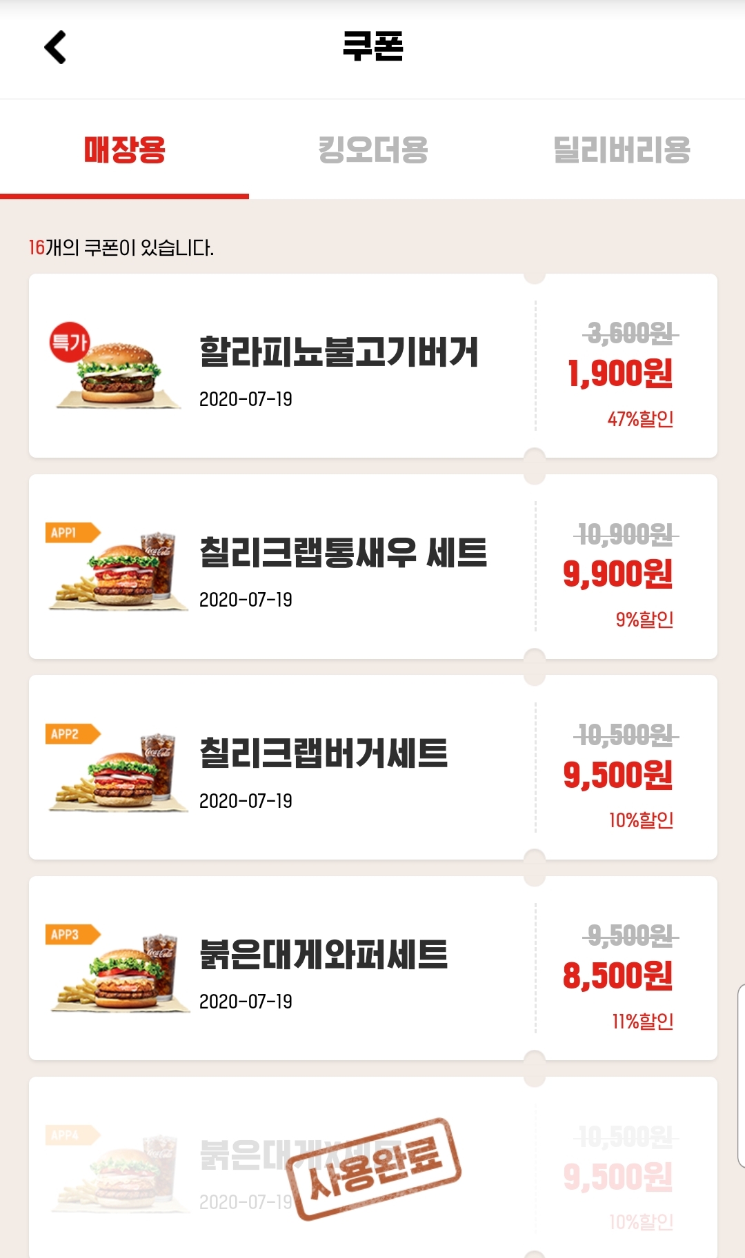 그러나 앱테크몽은 버거킹 어플에서 10% 할인쿠폰을 받아 9,500원에 구매했습니다!