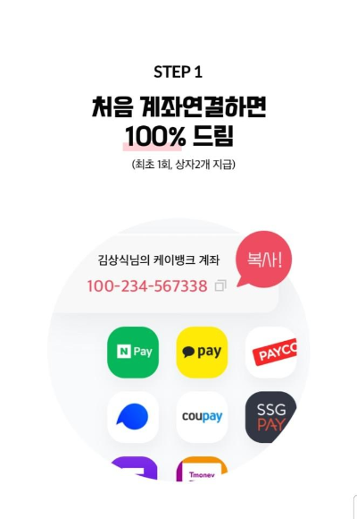 계좌연결은 네이버페이, 카카오페이, 토스 등에서 케이뱅크 계좌를 연결하는 것을 말하는데요, 해당 어플에 접속하여 케이뱅크 계좌를 충전계좌로 연결하시면 최대 상자가 2개까지 지급됩니다.