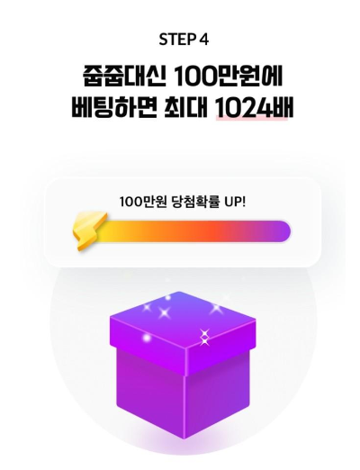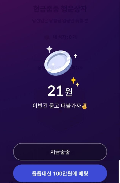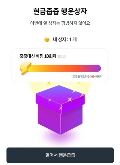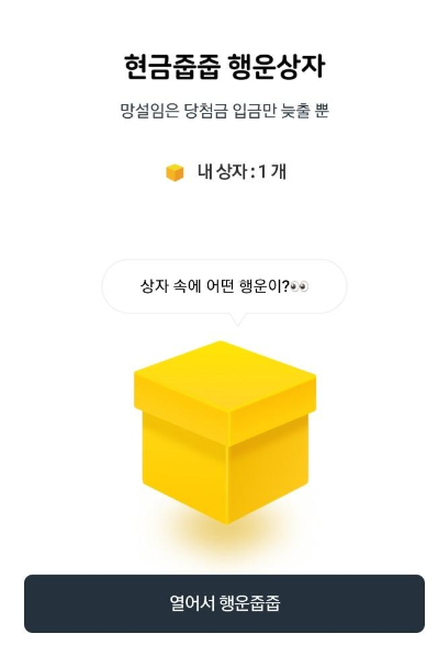 상자를 하나 열때마다 현금으로 바로 받을 수도 있고 적립해서 100만원 받기에 베팅을 할 수 있습니다. (100만원에 당첨이 안되더라도 현금을 받을 수 있습니다.)