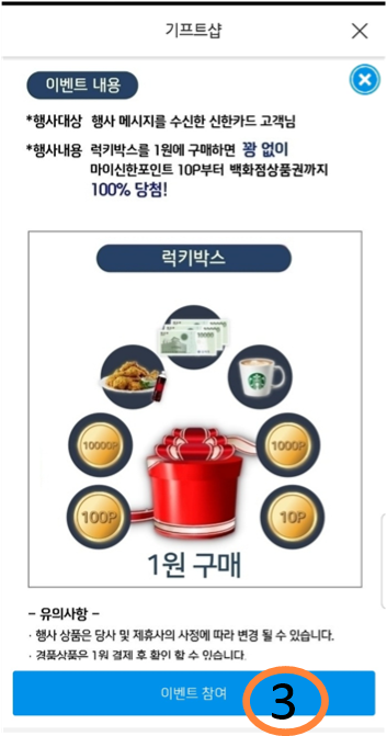 참여방법은 신한페이 판 -> 메뉴 -> 기프트샾 -> 메인화면의 LUCK BOX 클릭 -> 1원 결제 순서입니다.