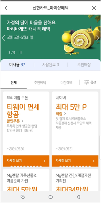 참여방법은 신한페이판-> 할인 쿠폰-> 모든 혜택 더하기를 통해 신한카드로 결제하면 다음 카드 결제일에 환급받을 수 있습니다.