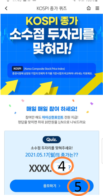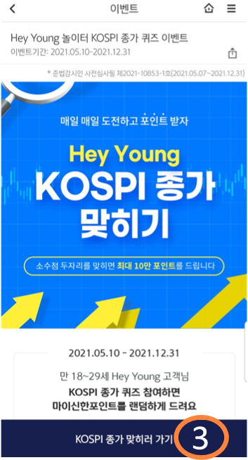 이 이벤트는 만 18세에서 만 29세까지만 참여할 수 있는 이벤트입니다. 이벤트 기간은 2021년 12월 31일까지이며 KOSPI 종가 소수점 두 자리를 맞추면 10만 포인트를 정답자 간에 나누어 갖는 이벤트입니다. 정답자가 혼자라면..?? 10만 포인트가 모두 내 것!!! 정답을 맞히지 못하더라도 참여만 하면 포인트를 획득할 수 있으니 잊지 말고 꼭 참여해주세요!!