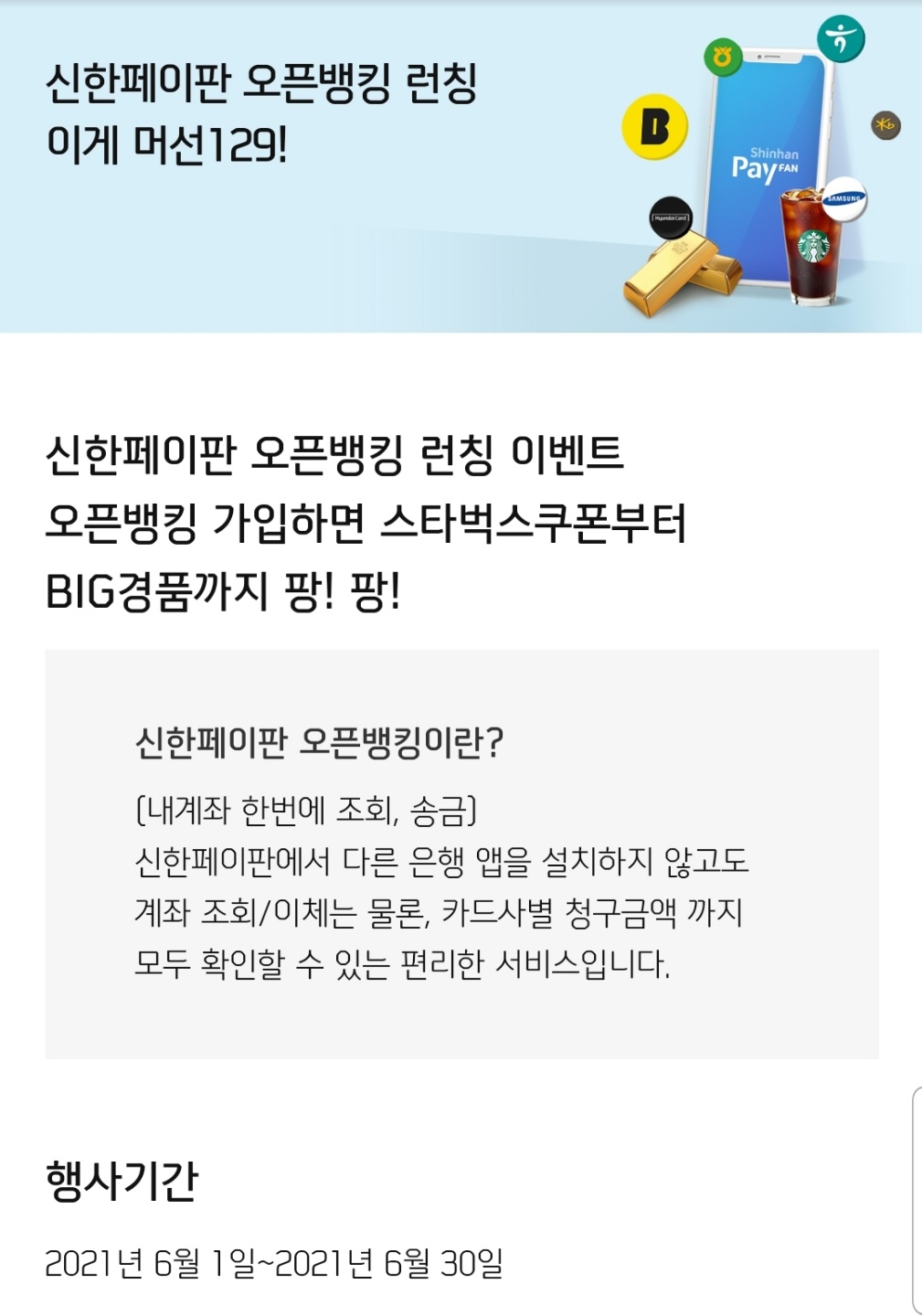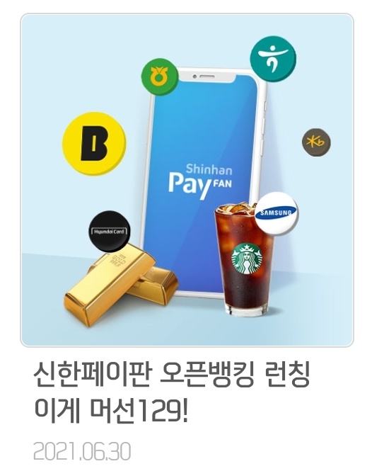 신한은행 오픈뱅킹은 신한페이 판이라는 어플을 통해 가입할 수 있습니다. 참여방법은 신한페이 판 어플->혜택->진행중 이벤트->[신한페이판 오픈뱅킹 런칭 이게 머선129!]를 통해 참여할 수 있습니다. 기간은 6월 30일까지 진행되며 경품으로는 스타벅스 쿠폰(선착순 10만 명 100% 증정), 골드바 100g, 13형 멕북에어, 에어판, 신세계상품권 5만원권, 문화상품권 3만원권, BBQ바사칸치킨 + 콜라1.25L가 추첨을 통해 주어집니다. 또한 6월 한 달간 송금수수료 100%무료의 혜택까지 주어집니다. 당첨자 발표는 7월 7일입니다.