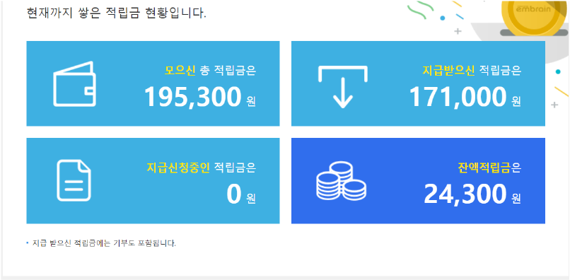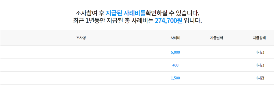 그리고 엠브레인의 장점은 설문조사 대상에 선정되지 않더라도 최소 참여비를 지급합니다. 타 사이트는 설문조사 대상자에 선정되지 않으면 아예 지급을 하지 않는 경우가 많이 있습니다.