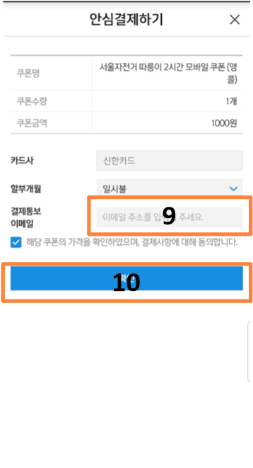 6번 <쿠폰 받기>를 클릭하고 7번에서 <1시간 이용권 또는 2시간 이용권을 선택>을 하고 8번의 <신한카드 결제>를 누릅니다. 포인트로 결제 시 30% 추가 캐시백이 안되기 때문에 저는 신한카드 결제로 하였습니다. 그리고 9번에 <이메일 주소>를 입력하고 <결제사항에 동의> 하고 10번 <확인>을 눌러줍니다.