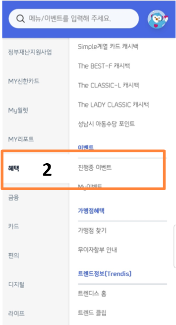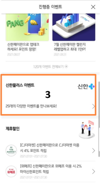 먼저 신한페이 판에 접속한 다음에 1번의 <메뉴> 버튼을 누르고 <혜택>. <진행 중 이벤트>를 차례로 클릭합니다. 그리고 아래로 내리면 3번 <신한플러스 이벤트>가 나오며, 이를 클릭을 합니다.
