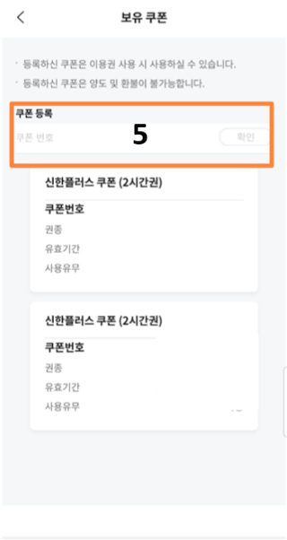 이제 드디어 마지막 단계입니다. 4번의 <쿠폰 관리>를 클릭하고 5번에 복사한 쿠폰번호를 붙여 넣고 확인만 누르면 끝입니다.