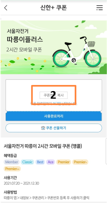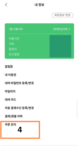 1번의 <나의 쿠폰>에 가서 2번의 쿠폰번호 복사를 누릅니다. 그리고 따릉이 어플에 접속을 하여 메뉴 버튼을 누른 후 3번의 <내 아이디>를 누릅니다.