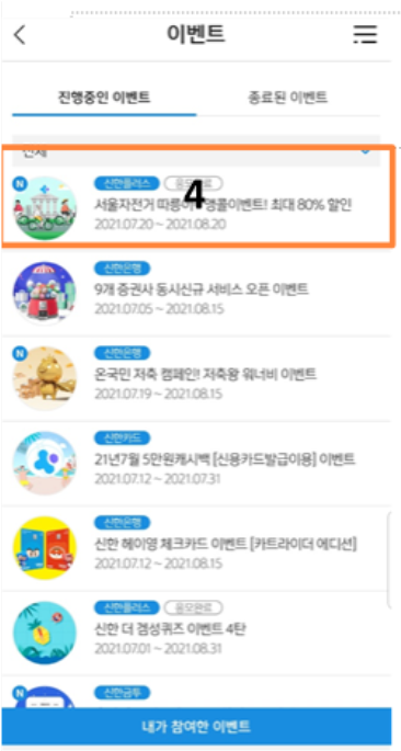 지금까지 잘 따라오셨나요? 다음에는 진행 중 이벤트의 맨 위에 있는 4번의 <서울자전거 따릉이 앵콜이벤트! 최대 80% 할인>을 클릭하고, 맨 밑으로 내려 5번 <따릉이 플러스가기>를 클릭합니다.