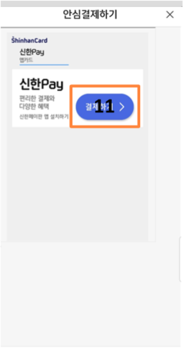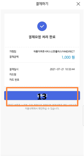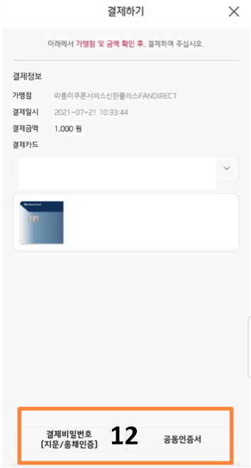 11번 <결제하기>를 누르고 카드를 선택한 다음에 12번 <결제비밀번호 또는 공동인증서로 결제>를 합니다. 이제 결제까지 끝났으면 13번 <결제확인>을 클릭합니다.