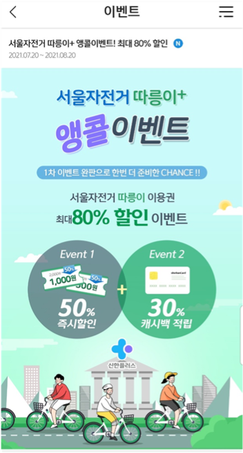 지금 신한페이 판에서는 따릉이 이용권을 50% 즉시 할인받아 구매할 수 있으며 30%는 캐시백을 해주고 있습니다. 정리하면 총 80%를 할인받아 구매할 수 있습니다.