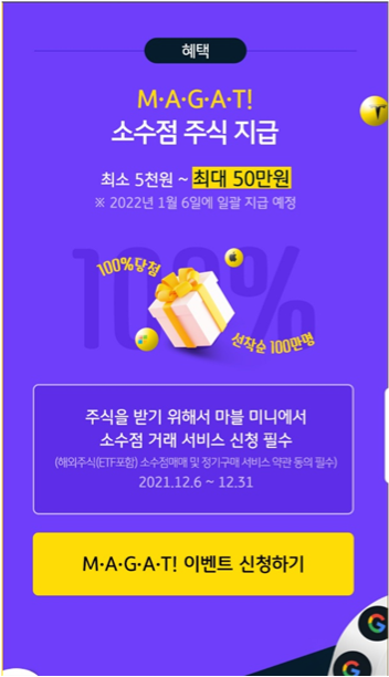 먼저 해당 이벤트는 'MAGAT(마가트) 이벤트 신청하기' 버튼만 누르면 간단하게 소수점 주식 지급 이벤트에 참여할 수 있습니다. 미국주식 소수점 거래 이벤트 당첨금액은 최소 5천 원에서 ~ 최대 50만 원까지이며 당첨된 주식 지급일은 22년 1월 6일입니다. 제세공과금 등 세금은 KB증권에서 부담한다고 하니 당첨된 금액을 세금 공제 없이 모두 받을 수 있습니다.