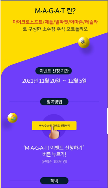 해당 이벤트는 'M·A·G·A·T 이벤트 신청하기' 버튼만 누르면 선착순 100만 명에게 혜택을 주는 간단한 이벤트입니다.