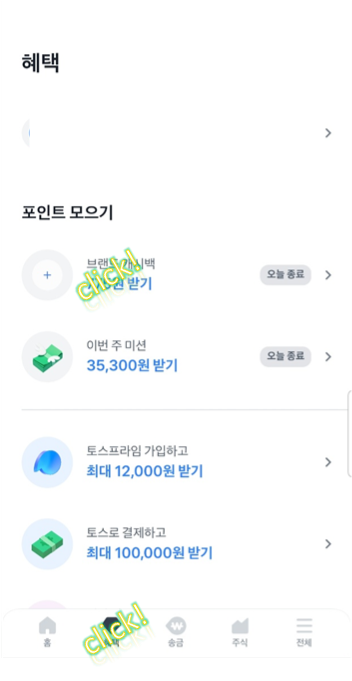 토스 -> 메뉴에서 '혜택'->브랜드 캐시백