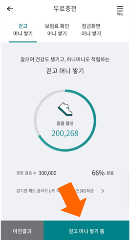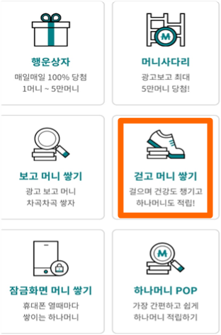 '걷고 머니 쌓기'는 한 달 동안 300,000보를 걸으면 100 머니를 적립해 줍니다.
