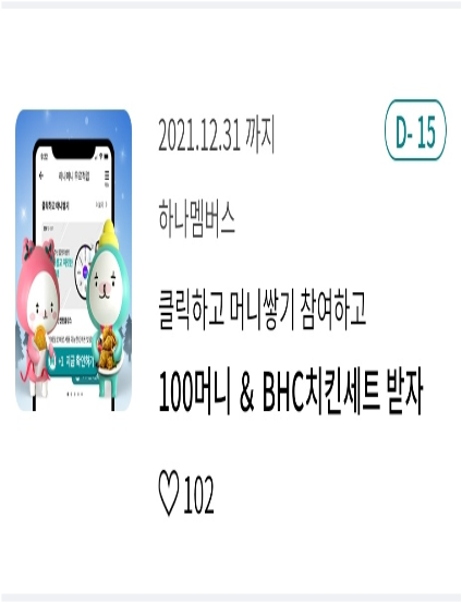 또한 위에서 소개해드렸던 '클릭하기 머니쌓기'를 처음 하시는 분이라면 100 머니와 BHC 뿌링클 치킨+콜라 1.25L를 추첨을 통해서 증정을 해주고 있습니다. '이벤트 참여하기'를 통해 참여할 수 있습니다.