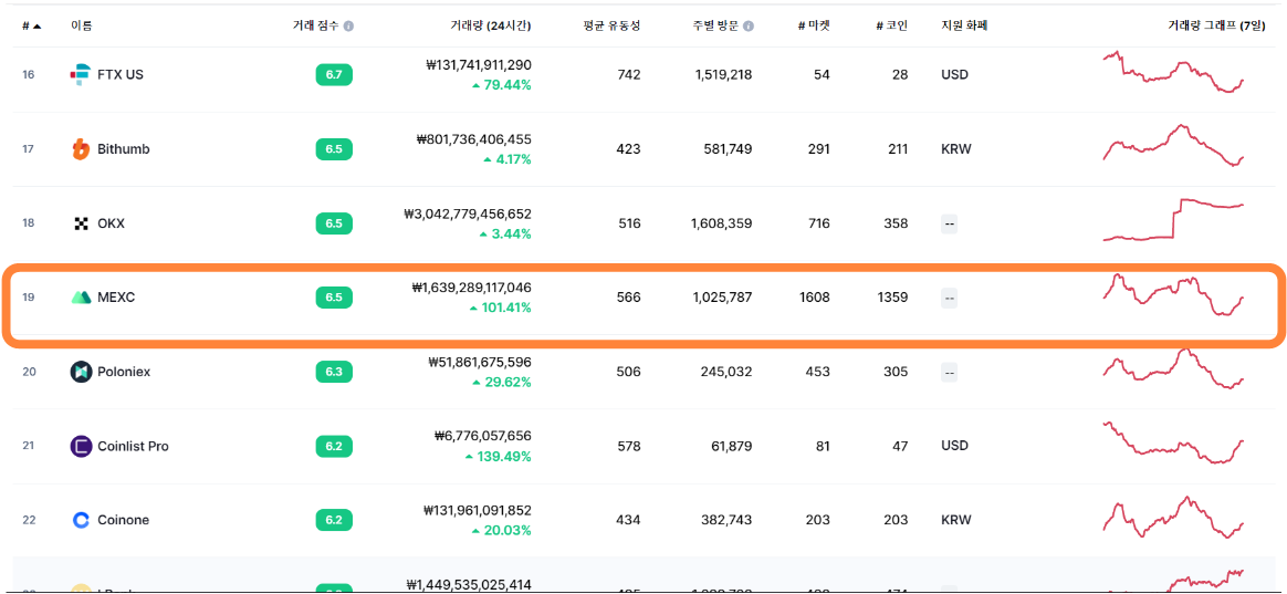 코인마켓캡에 따르면 가상화폐 거래소 순이 16위에 랭크되어 있습니다. 그만큼 거래량이 활발한 거래소입니다. 또한 MEXC거래소의 특징으로는 다음과 같습니다.